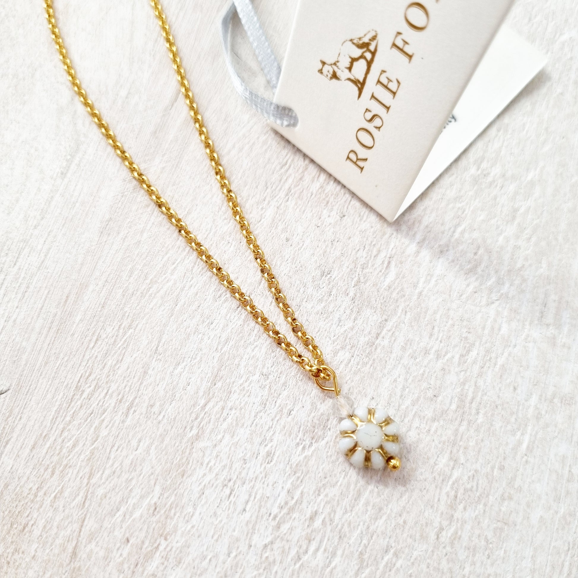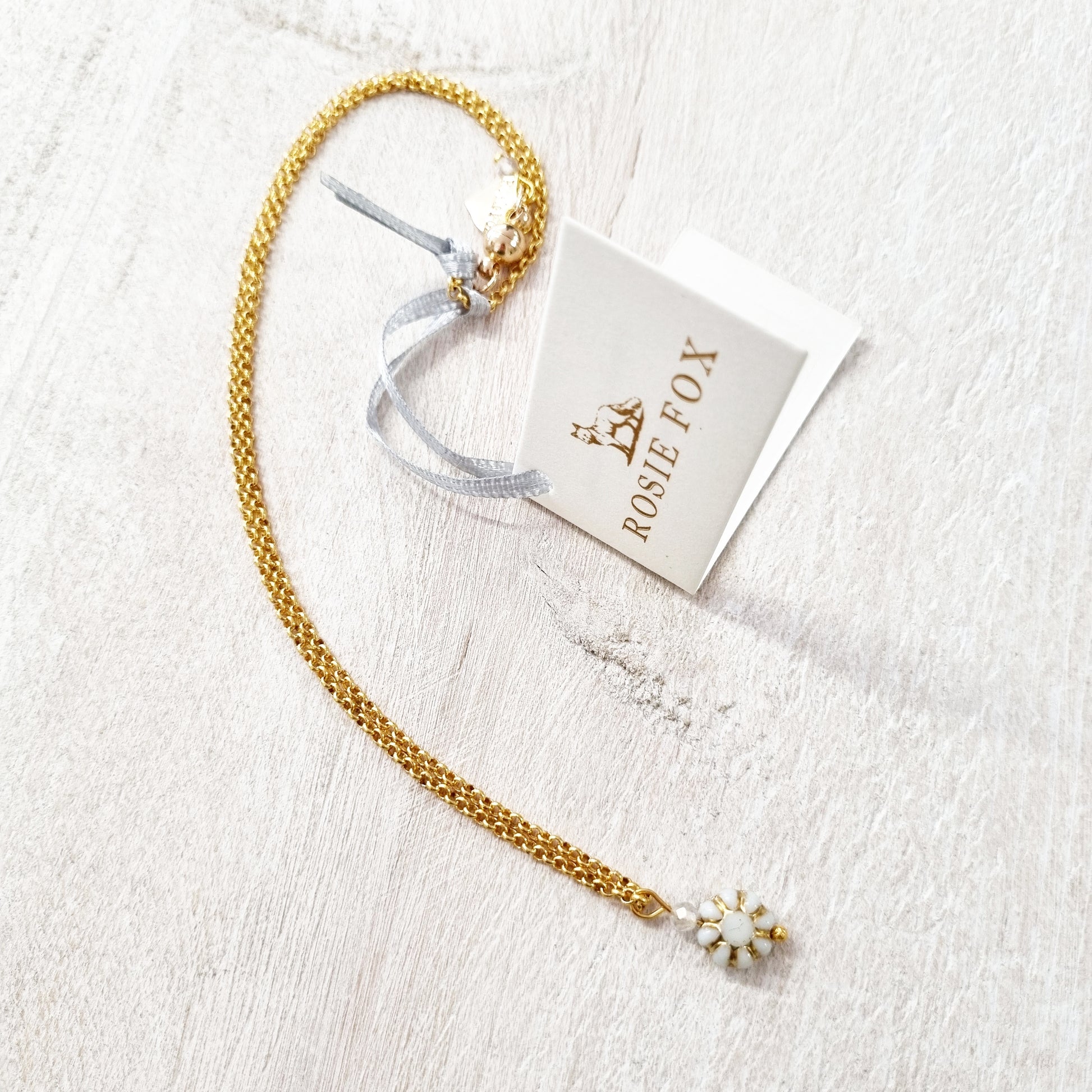 With 14ct Gold plated chain & a stunning 'Belle' flower charm measuring 1cm in diameter, finished using a gold magnet clasp with their signature 14ct Gold plated Rosie Fox heart charm.