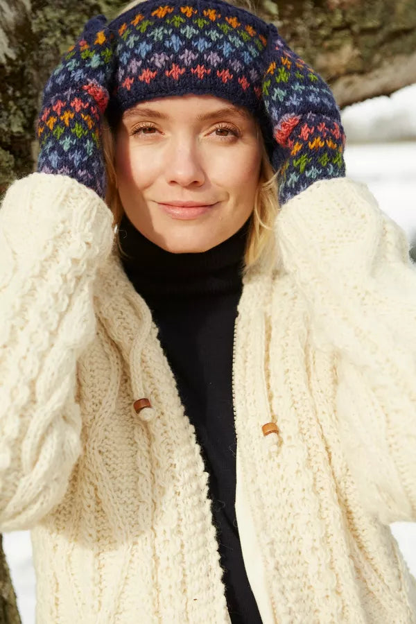 Bands of traditional patterns made up of carefully selected colours in a range of simple patterns which may vary from piece to piece.. Close the flap to keep your fingers warm.. Fasten back the flap with the coconut button to use your fingers
