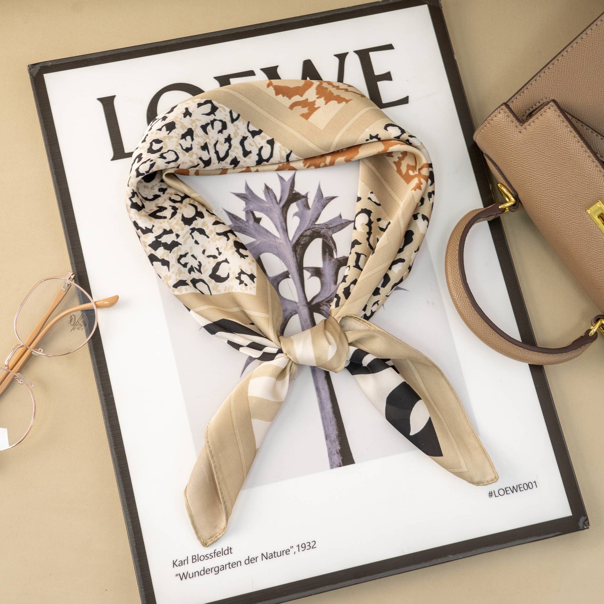 This 70x70 square scarf in polyester with a silk effect combines nine animal prints: leopard, zebra, and wild textures in black, brown, and white. Light, fluid, and ultra-soft, it glides elegantly over the skin. An accessory for an urban, chic, and instinctive look.