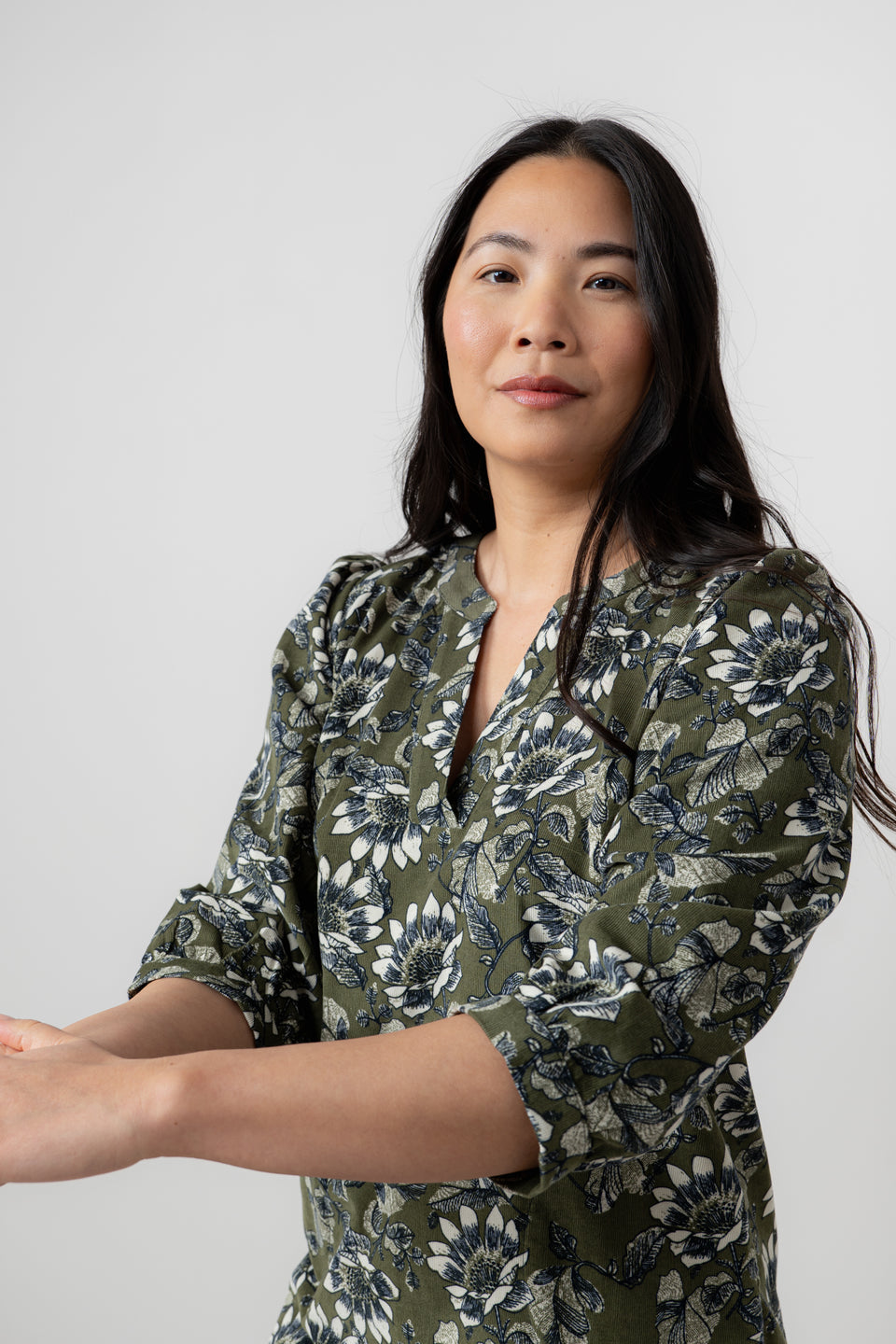 New this season, the Harvest Dress in a bespoke Lily mono bloom print is an easy wearing shift shape. Made from soft drapey cotton pincord, with a mandarin collar, flattering notch neckline and three quarter sleeves.