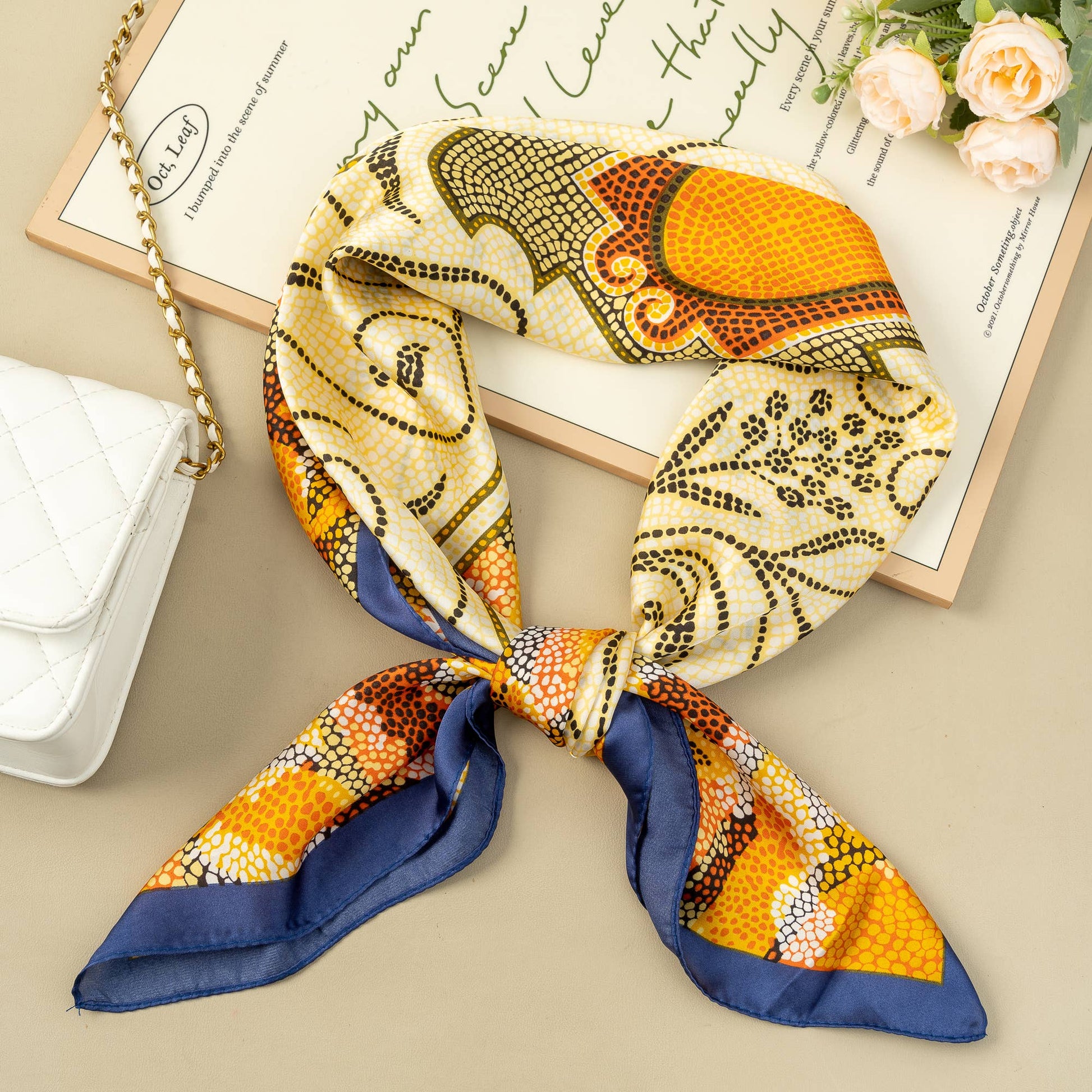 This square polyester scarf, 90 x 90 cm, brightens up any outfit with its floral and abstract patterns in shades of yellow, blue, and cream. Its soft and fluid fabric offers optimal comfort. Wear it around the neck, as a headband, or on a bag, it embodies freshness and femininity with an artistic touch.
