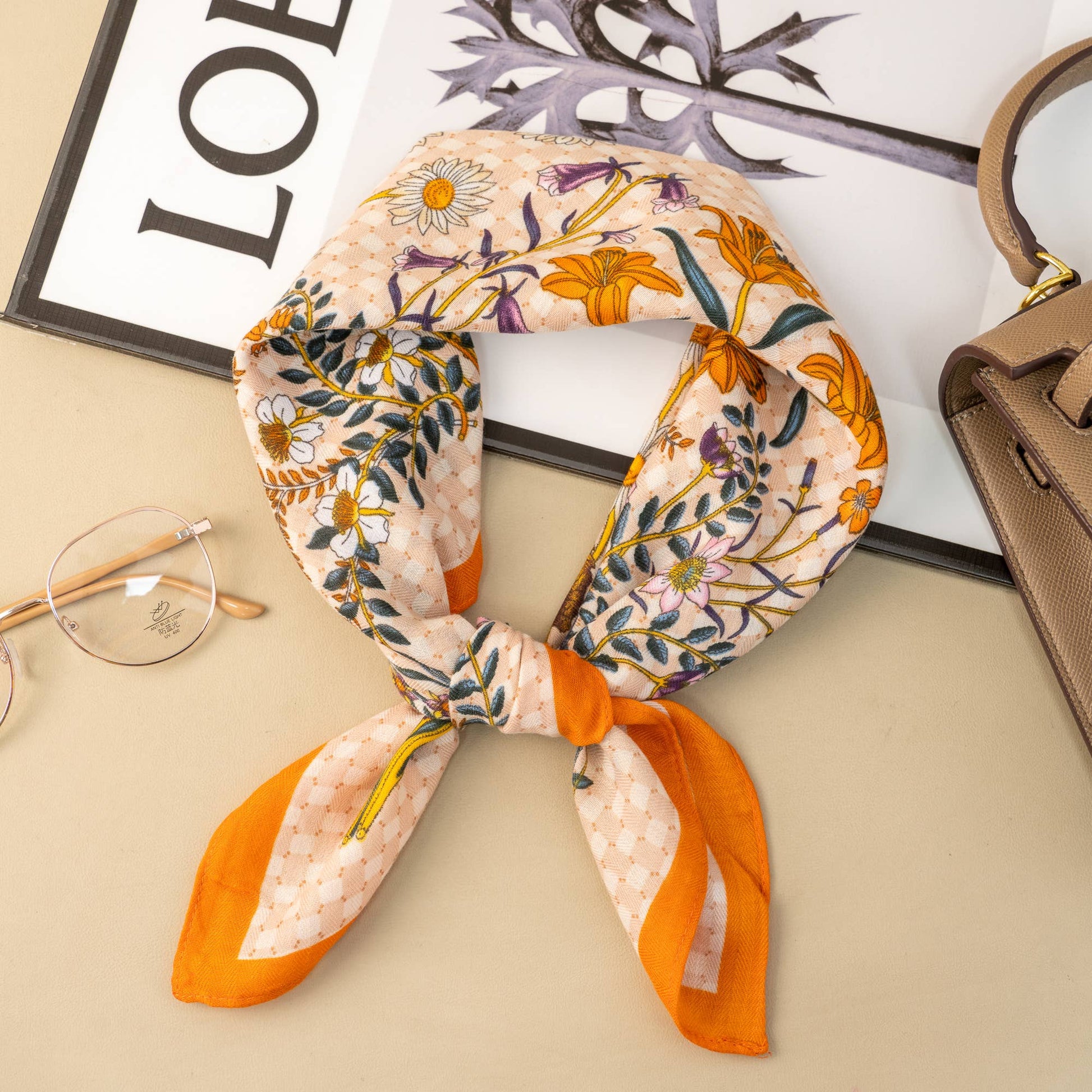 This 70x70 cm scarf with rustic floral patterns brightens up your outfits with its vivid orange accents and delicate flowers. Light, soft, and feminine, it can be worn around the neck, as a headband, or as a bag accessory. Ideal for a chic and natural look.